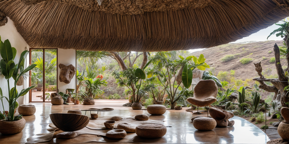 As dawn breaks, the golden hour illuminates the unique interior of a house designed by Cesar Manrique, revealing a cozy, yet primitive space. I wanted to capture this moment in an image, showcasing the smooth, earthy walls and wood materials contrasted with vibrant interior plants. This creation is a homage to Manrique's genius, blending nature with living spaces in harmony.